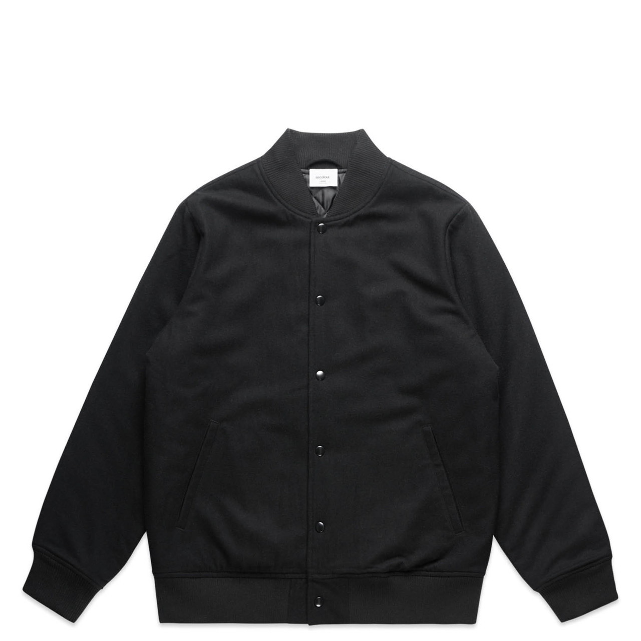 Discover the AS Colour Felt Bomber Jacket. Regular fitting with a heavy weight wool & recycled polyester blend felt body. Complete with a quilted padded lining, ribbed collar, YKK snap domes, two side pockets, and invisible lining access zip for seamless branding.